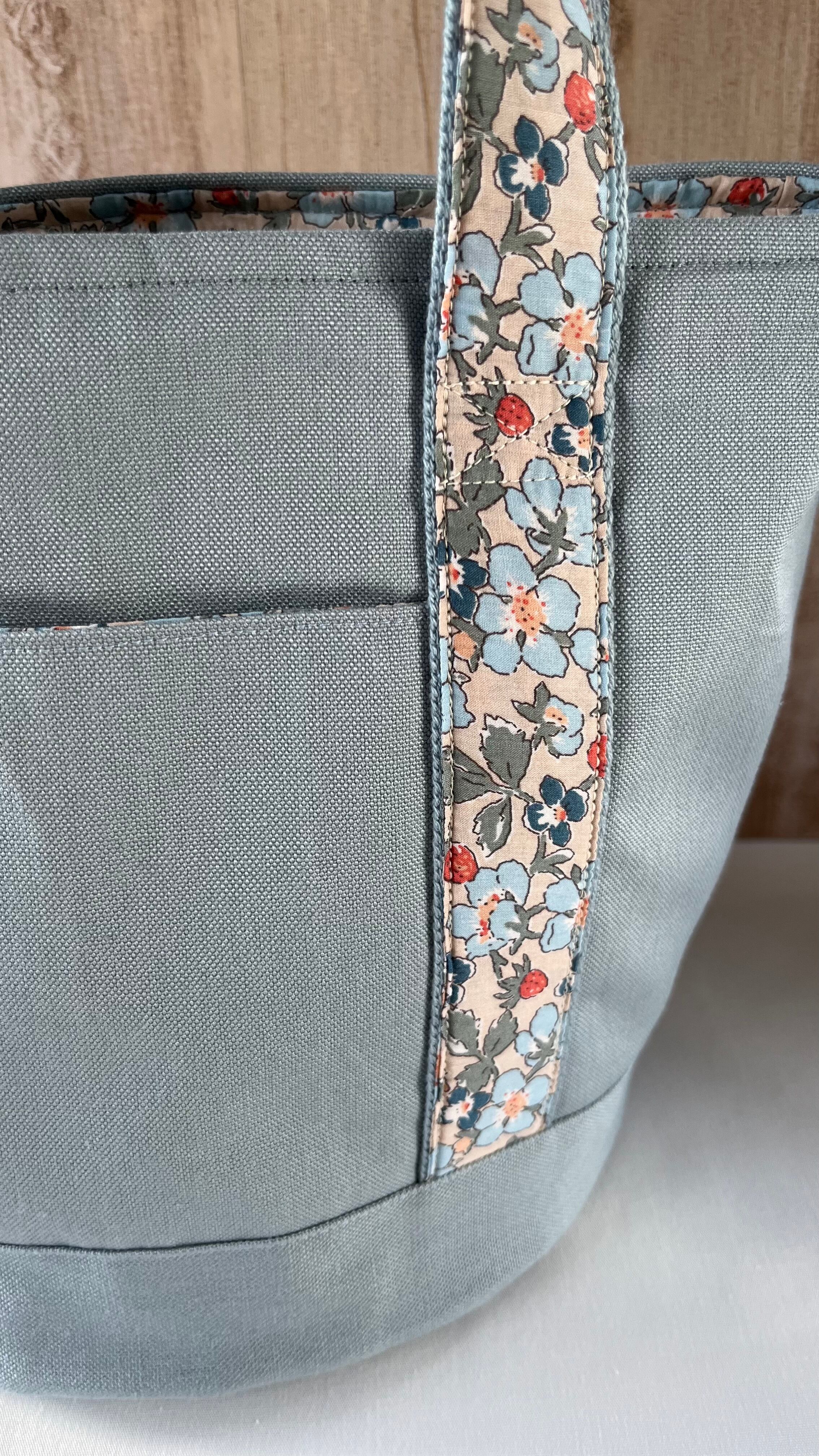 帆布のトートバッグはシンプルなものが多いですが、巾着部分と持ち手に花柄をつけて、大人可愛くしました